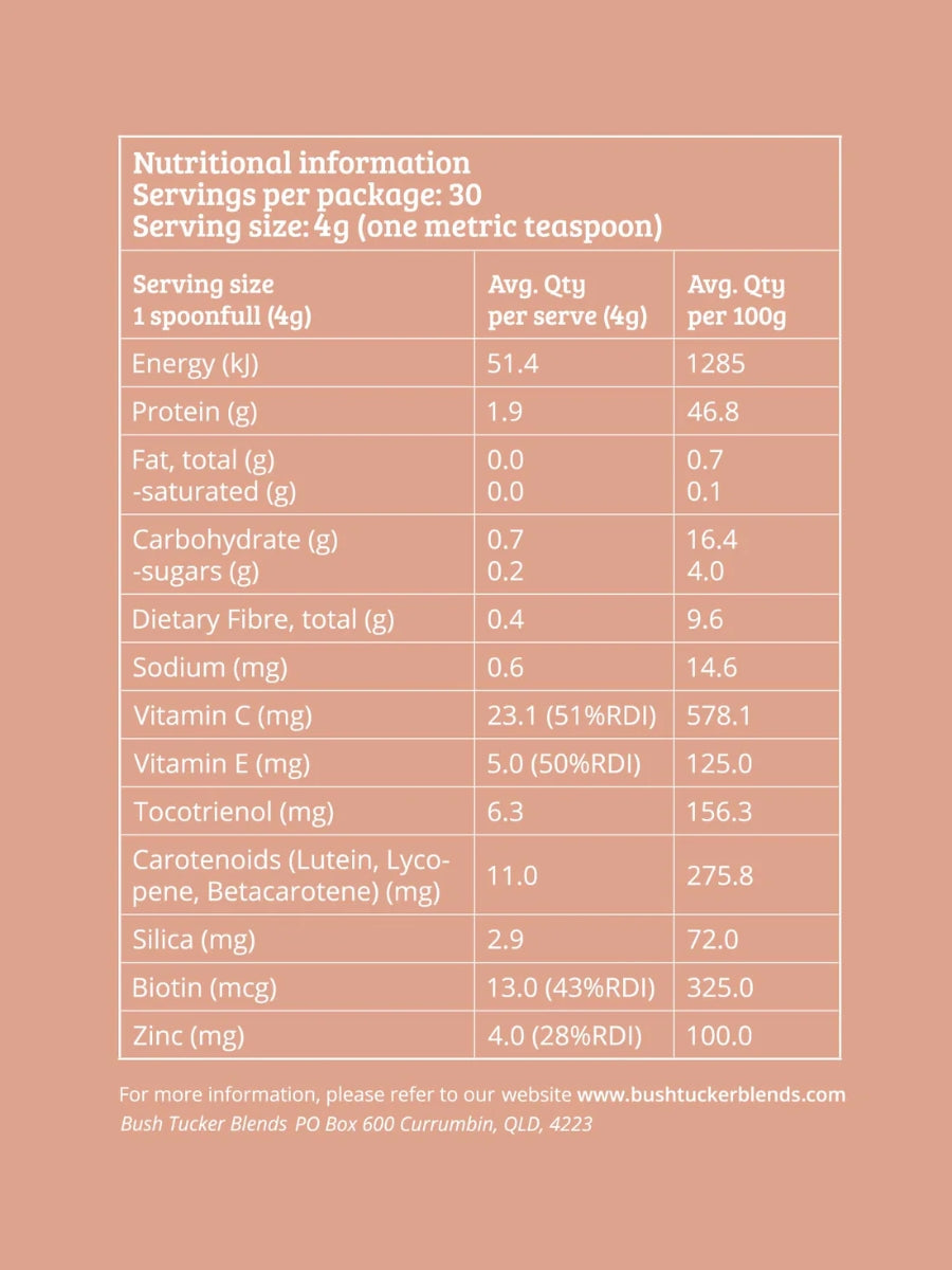 This is the worlds first Native Australian supercharged marine collagen peptides blend. Bush Tucker Blends' You Beauty blend combines wild harvested and organic Australian Native ingredients Kakadu Plum, Davidson Plum and Quandong with the world’s most potent, pure and sustainably wild caught marine collagen peptides to support skin, hair, nails, bones & joints all while boosting your collagen production.