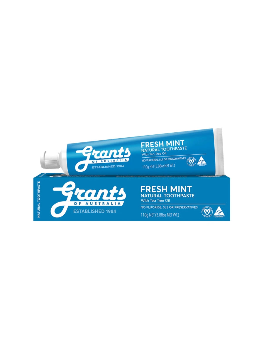 Grants Fresh Mint Toothpaste combines the cooling power of peppermint and spearmint with the natural benefits of tea tree oil to help reduce bacteria and support gum health. Refreshing and effective, it’s perfect for those who love a classic minty flavour and lasting fresh breath.